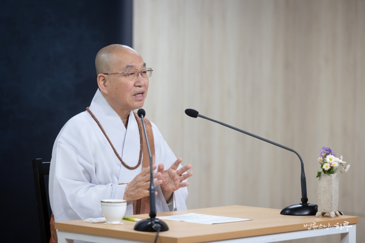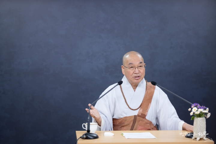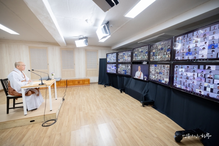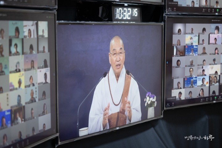 이어서 오전 10시가 되자 삼귀의와 반야심경을 봉독하며 전법회원 법회를 시작했습니다. 전법회원 모두가 화상 회의 방에 입장한 가운데 삼배의 예로 법문을 청했습니다. 스님은 격변하는 시대적 흐름을 이야기한 후 이 속에서도 수행과 책임 있는 실천의 자세를 잃지 말아야 함을 강조했습니다.