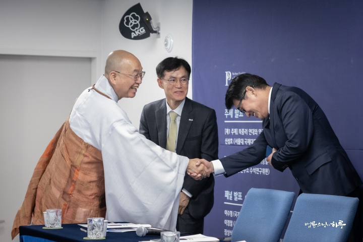 스님은 열정적으로 발표해 준 전문가 분들에게 감사의 마음을 전하며 악수를 건넸습니다.