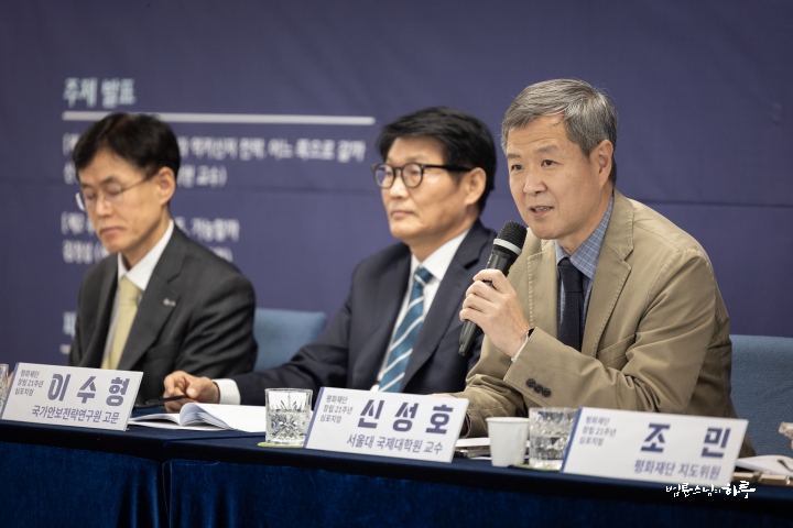 영상이 끝나자 사회를 맡은 조민(평화재단 지도 위원) 박사가 오늘 심포지엄의 주제를 소개했습니다.
