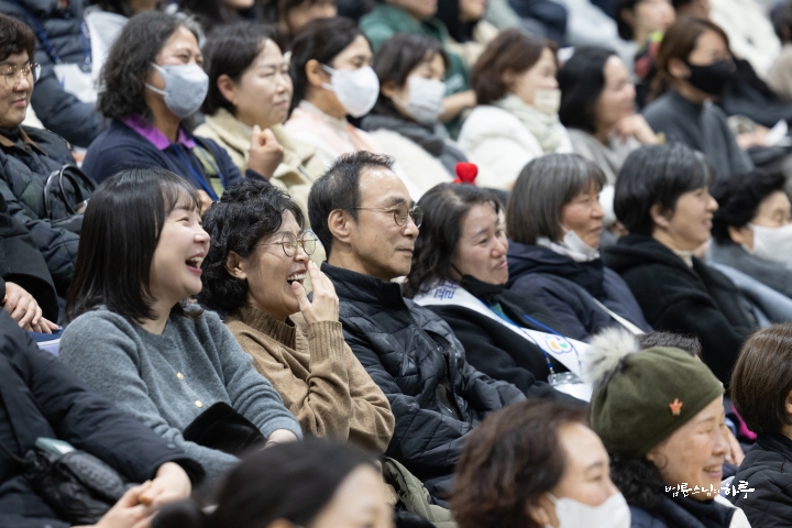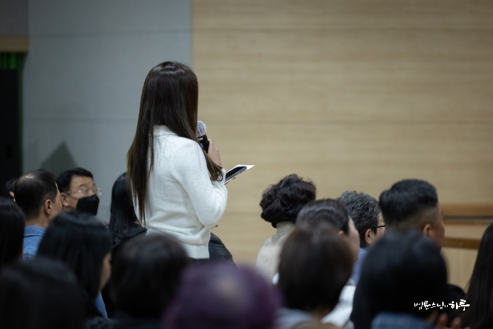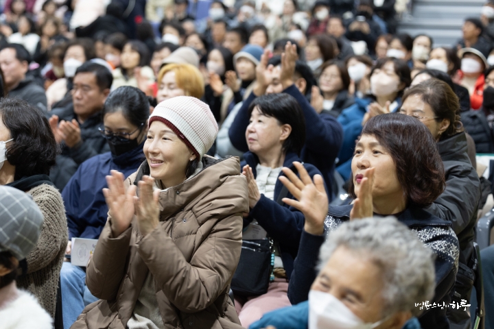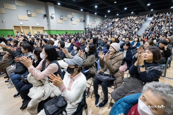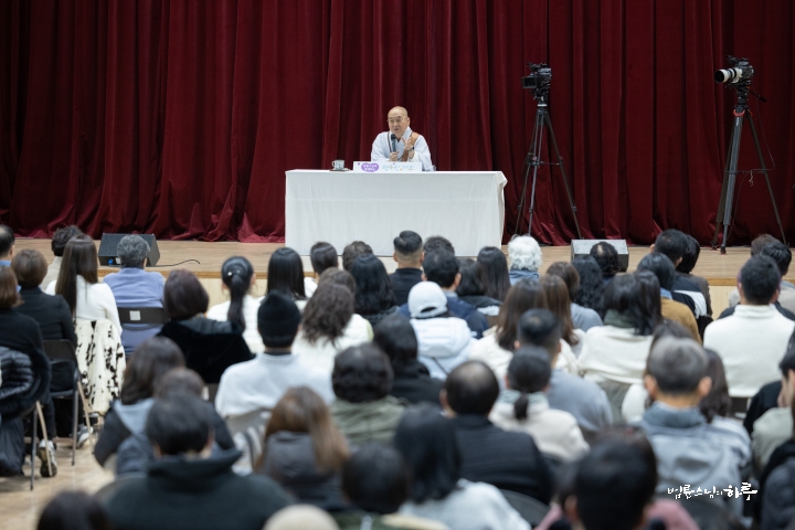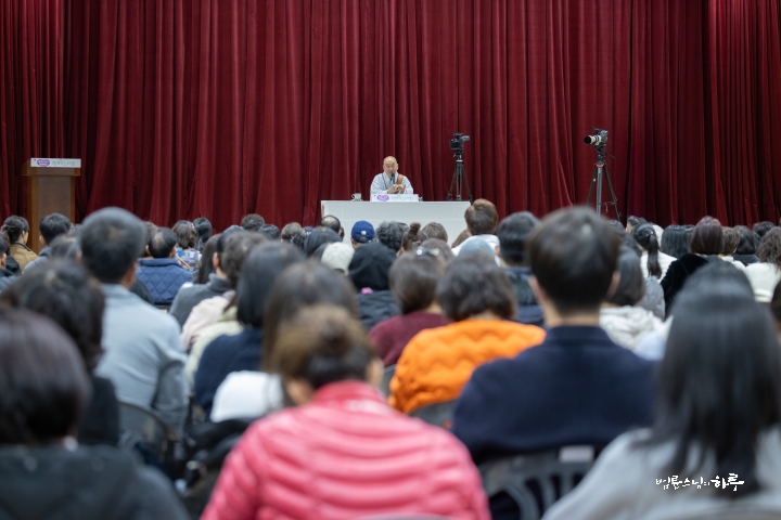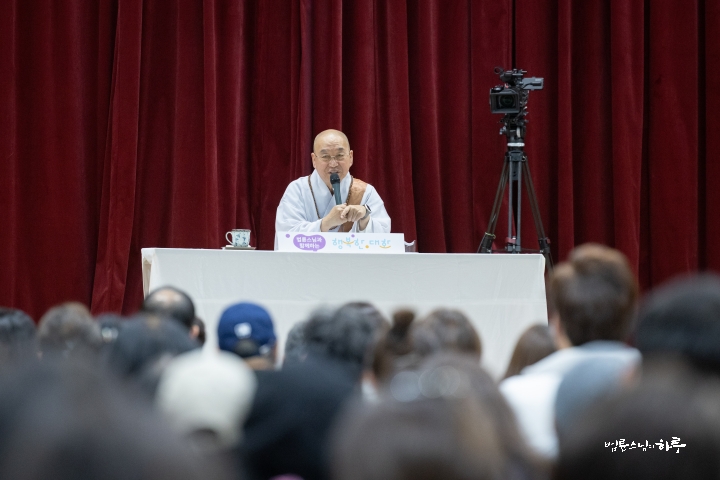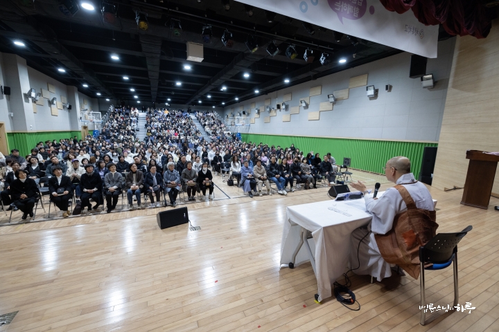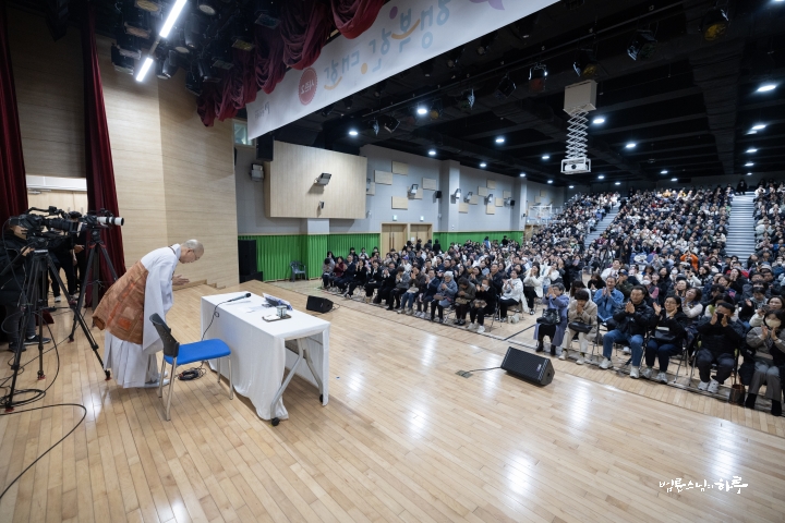 스님은 자리를 가득 메운 600여 명의 고양시 시민들에게 합장하고 인사를 한 후 대화를 시작했습니다. 스님은 지금 대한민국에 필요한 것은 새마을 운동을 넘어 새 마음 운동이라고 강조했습니다.