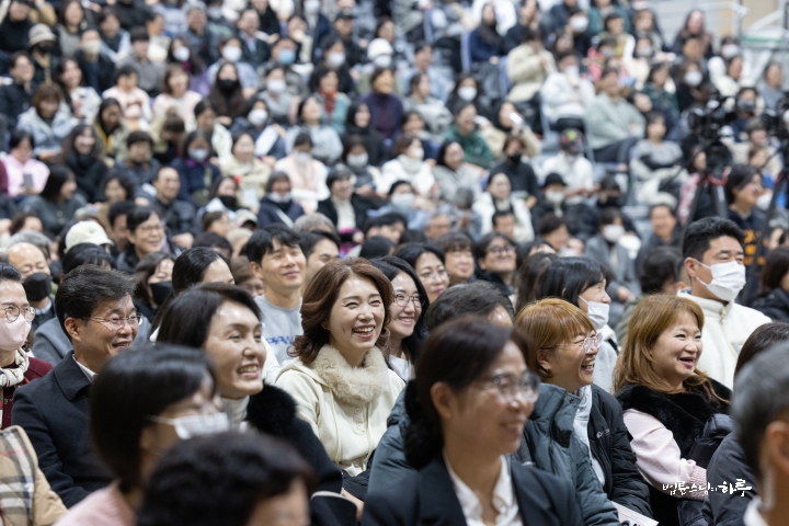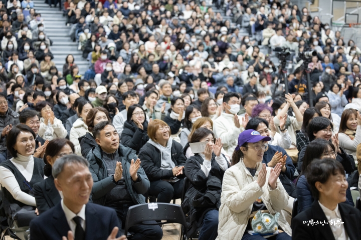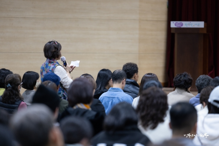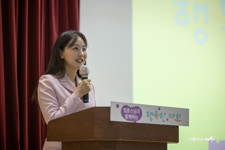 “행복학교는 종교를 초월해 오로지 삶의 행복도를 높이는 데 초점을 둡니다. 우리가 행복하게 살기 위해서는 정부의 역할도 필요하지만, 민간에서도 이런 국민 행복 운동을 함께 만들어 가는 것이 중요합니다. 그래서 오늘 강연도 무료로 진행합니다. 강의도 무료이고, 일하시는 분들도 모두 자원봉사자예요. 이 운동이 지속되려면 봉사자들의 도움이 반드시 필요합니다. 홍보하고, 안내하고, 진행할 손길이 필요하죠. 오시는 길에 강연장 입구에서 안내하던 봉사자들 보셨지요? 이렇게 많은 봉사자 덕분에 이 운동이 유지됩니다. 앞으로 여러분도 이런 봉사 활동에 동참해 주시기 바랍니다. 정부만 바라보고 불평할 것이 아니라, 우리가 할 수 있는 일을 우리가 해야 합니다.