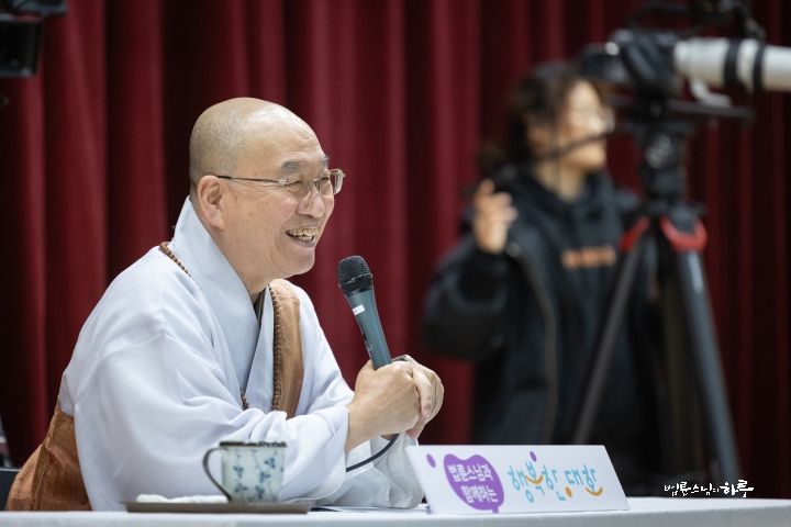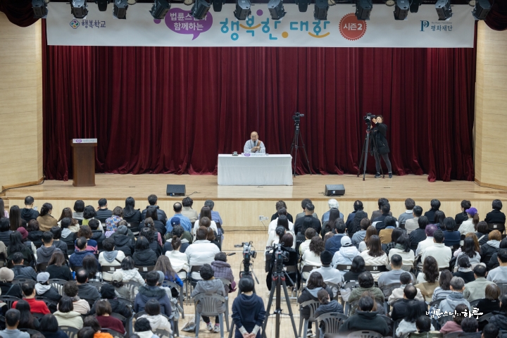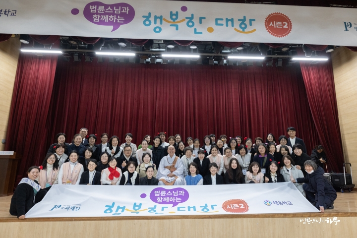 이런 관점을 나누기 위해 만든 프로그램이 바로 ‘행복학교’입니다. 사회 제도적으로는 노인에게 수당을 지급하고 요양 시설을 개선하며, 실직하면 실업 수당을 지원하고, 주거가 어려우면 집을 제공하고, 아이들에게 교육비를 지원하는 등 사회적 안전장치를 더 촘촘히 마련해 나가야 합니다. 아직 우리나라는 이런 지원이 부족한 편입니다. 하지만 사회적 지원만으로는 충분하지 않습니다. 왜냐하면, 정부가 할 수 없는 영역이 있기 때문입니다. 국민 행복도를 높이려면 민간 차원의 국민 운동도 필요합니다. 불교를 포교하거나 정토회를 키우자는 뜻이 아니라, 모든 국민이 행복한 삶을 살 수 있도록 돕는 국민 운동을 하기 위해 만든 프로그램이 바로 ‘행복학교’입니다. 즉, 우리 스스로 행복도를 높이자는 취지입니다. 오늘 강연 역시 그 연장선에 있습니다. 여러분이 보기에는 행복학교가 국민들의 괴로움을 조금이라도 덜어주는 데 도움이 되었다고 생각합니까? 우리 사회의 자살률을 낮추는 데 조금이나마 기여했다고 생각하시나요?”