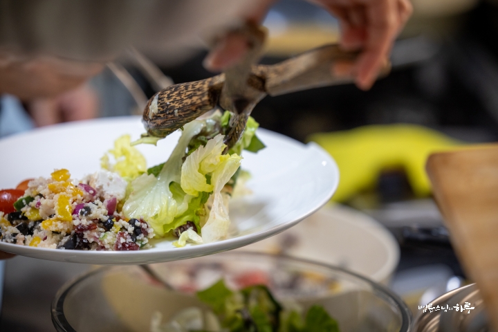 김홍진 신부님이 손수 음식을 요리하여 밥상을 푸짐하게 차려 주었습니다.