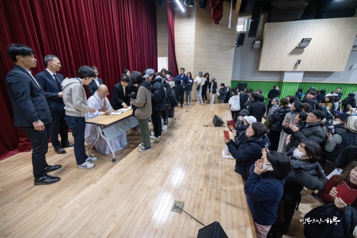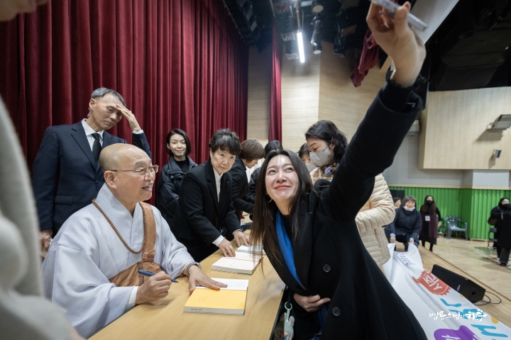 이어서 곧바로 무대 위에서 책 사인회를 시작했습니다. 대부분의 청중이 책을 한 권씩 손에 들고 스님에게 사인을 받았습니다.