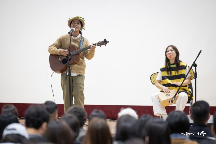 저녁 7시 30분이 되자 인디 밴드 ‘요술 당나귀’가 재능 기부로 노래 두 곡을 신명나게 불러 주었습니다. ‘기차를 타고’, ‘천지인’ 두 곡을 연달아 부르는 동안 강연장의 분위기는 후끈 달아올랐습니다.