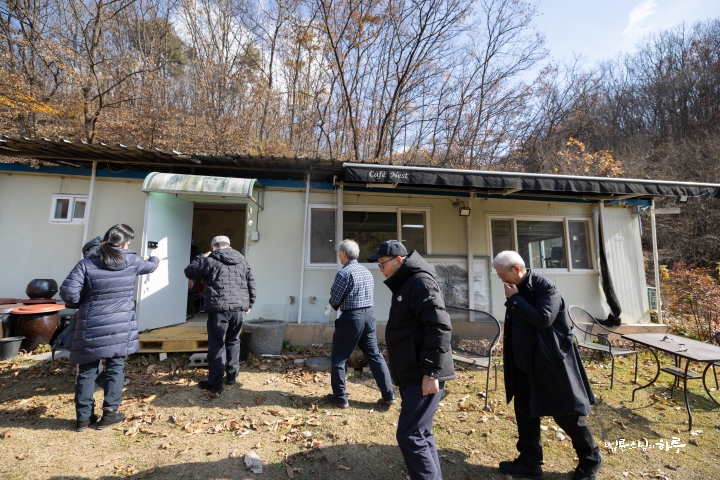 영동읍에서 시골길을 따라 산속 깊숙이 들어가자 김홍진 신부님의 농장이 나타났습니다. 차에서 내리자 다행히 농장 한편에 조립식 판잣집이 있었습니다. 신부님이 바쁘게 음식 준비를 하다가 종교인 분들을 반갑게 맞이했습니다.