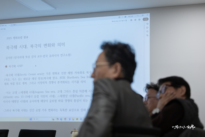 점심 식사를 한 후 오후 1시부터는 평화재단 회의실에서 ‘북극해 시대에 북극의 변화와 그 의미’를 주제로 열린 평화재단 연구 세미나에 참석했습니다. 오늘 세미나에서는 김석환 한국외국어대학교 초빙 교수가 두 시간 동안 깊이 있는 발제를 해주었습니다.