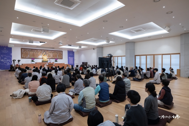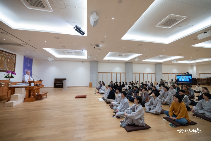 3층 설법전에는 100여 명의 대중이 모여 있었습니다. 오전 10시가 되자 삼귀의와 반야심경 독송으로 수행법회가 시작되었습니다. 정토회 회원들은 화상 회의 방에 접속해 온라인으로 법회에 참석했습니다.