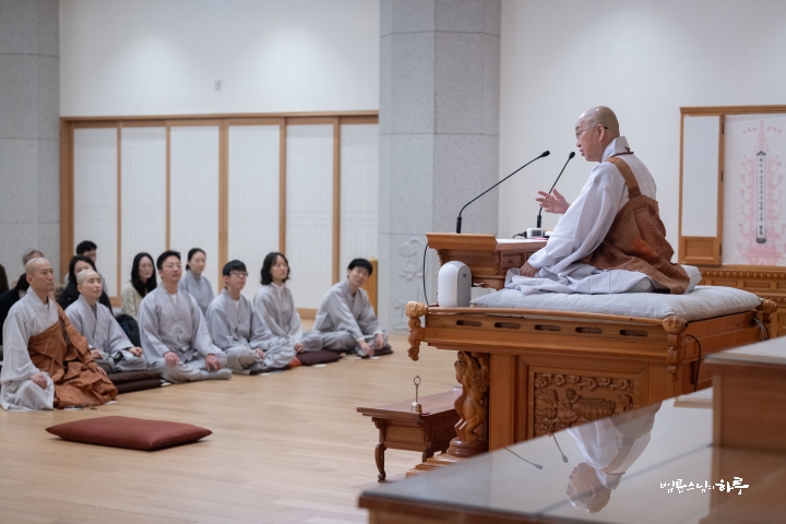 주간 정토행자의 소식을 영상으로 함께 본 후 대중이 삼배의 예로 스님에게 법문을 청했습니다. 스님은 오전 법회처럼 갑자기 추워진 날씨 이야기와 더불어 다가오는 1차 천일결사 회향 수련에 많은 회원들이 참석해줄 것을 당부한 후 대화를 시작했습니다.