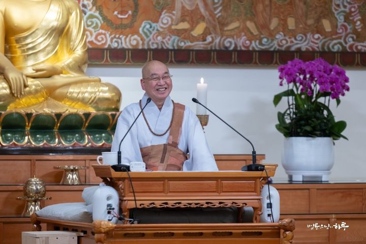 주간 정토행자의 소식을 영상으로 본 후 참석한 대중이 삼배의 예로 스님에게 법문을 청했습니다. 먼저 스님이 여는 말씀을 했습니다. 스님은 다가오는 1차 천일결사 회향수련에 대해 안내한 후 기복적 신앙을 넘어 스스로 행복을 가꾸고 사회적 가치를 실천해 온 정토회 활동의 의미에 대해 이야기해 주었습니다.