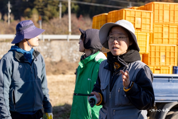 “이 밭에서 배추 670 포기를 수확한 다음에 다음 밭으로 이동해서 330 포기를 수확한 후 총 1000포기를 트럭에 싣고 두북수련원으로 가져가겠습니다. 배추가 손상되지 않도록 상자에 담은 채로 트럭에 실어 주세요. 상자가 모자라면 나머지는 톤백에 담겠습니다.”