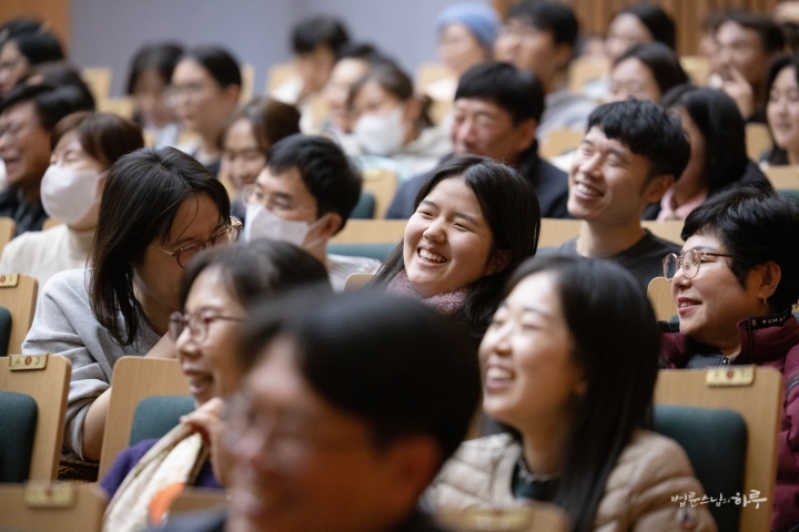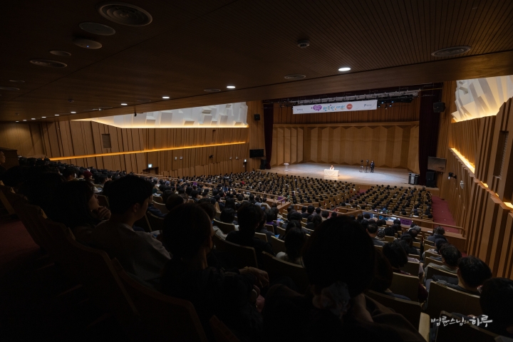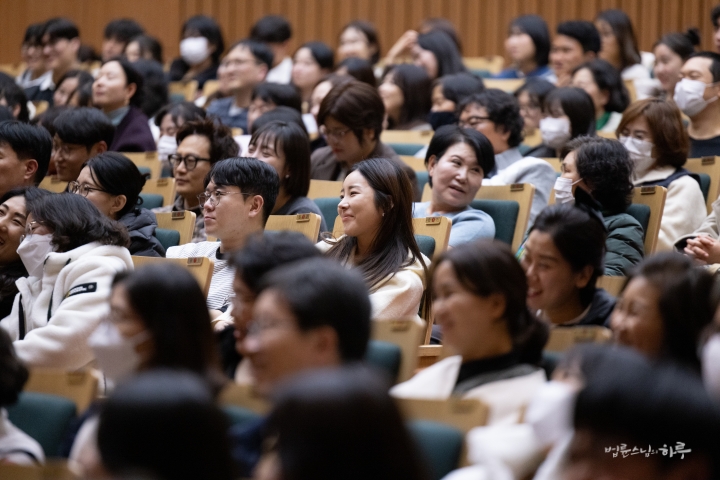 오늘 강연이 열리는 곳은 전남대학교 민주 마루 대강당입니다. 2025년도에 열리는 행복한 대화 즉문즉설 열 번째 강연입니다. 스님이 도착하자 강연을 준비한 광주 행복시민들이 반갑게 스님을 환영해 주었습니다.