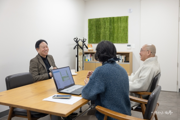 정토회관에 도착하여 짐을 풀고 아침 식사를 한 후 오전 10시부터 평화재단에서 박진도 교수와 미팅을 했습니다. 박진도 교수는 최근에 '국민총행복 전환 포럼'을 이끌며 여러 국회 의원들과 함께 국민총행복 증진을 위한 ‘국민총행복 기본법’ 제정과 국정 과제 반영을 위해 노력하고 있는데요. 다가오는 12월 3일에는 국회로 스님을 초청하여 ‘국민총행복의 길’이라는 주제로 강연을 해 달라고 요청했습니다.