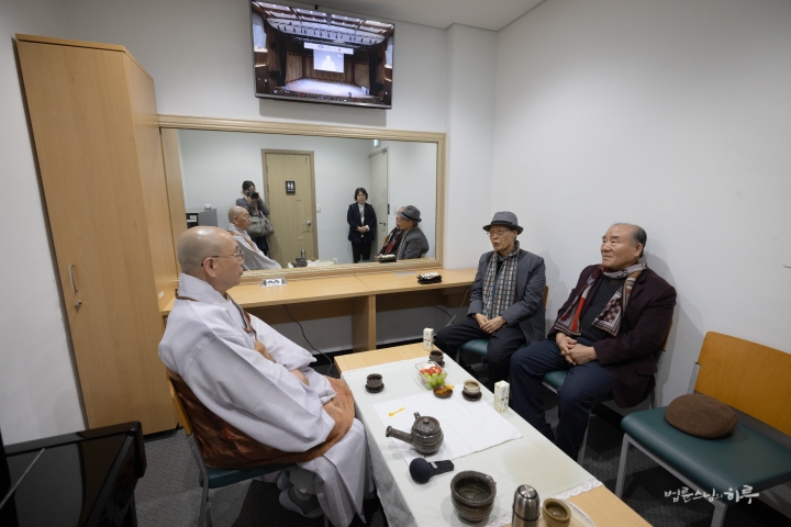 스님은 강연 전 대기실에서 지역 인사들과 차담을 나눈 후 함께 강연장으로 이동했습니다.