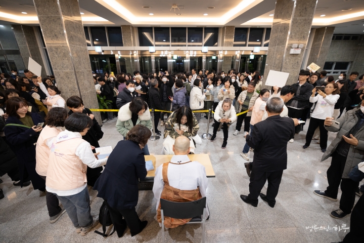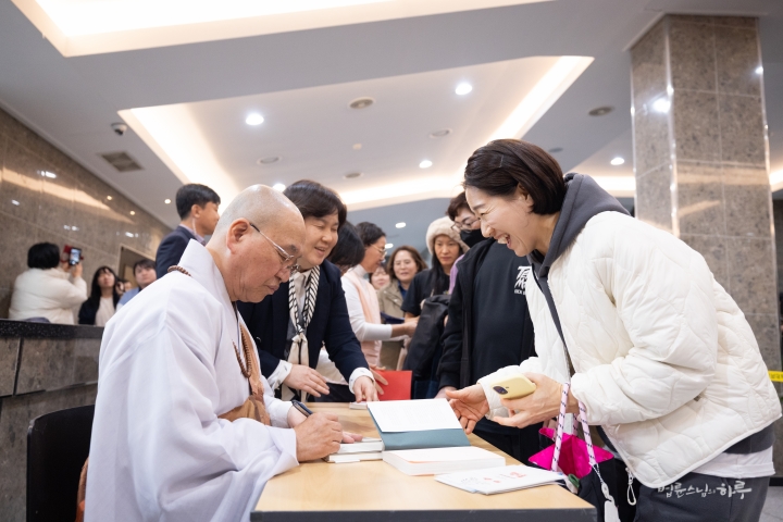 이어서 로비로 이동하여 책 사인회를 시작했습니다. 대부분의 청중들이 길게 줄을 서서 스님의 사인을 받고 감사의 마음을 표시했습니다.