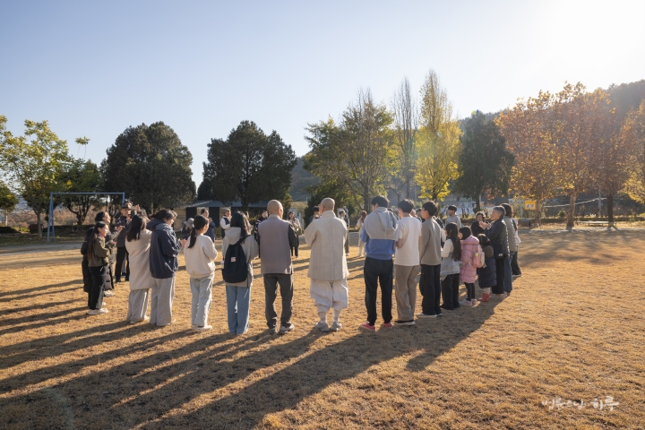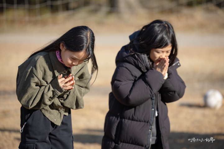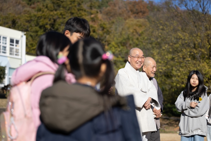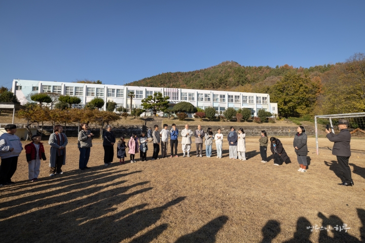 운동장에 동그랗게 모여 선 채로 조촐한 환영식을 진행했습니다. 스무 명 남짓한 아이들과 선생님들이 인사를 건네며 스님에게 한 말씀을 청했습니다.