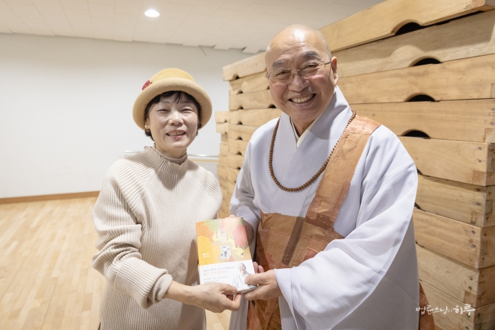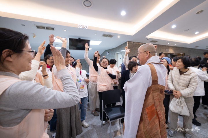 재미있는 구호를 함께 외친 후 모두가 활짝 웃었습니다. 스님은 봉사자들에게 감사의 마음을 전한 후 강연장을 나왔습니다.
