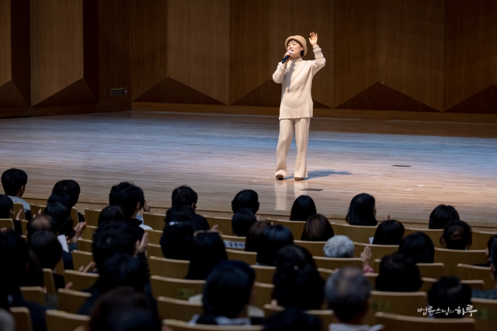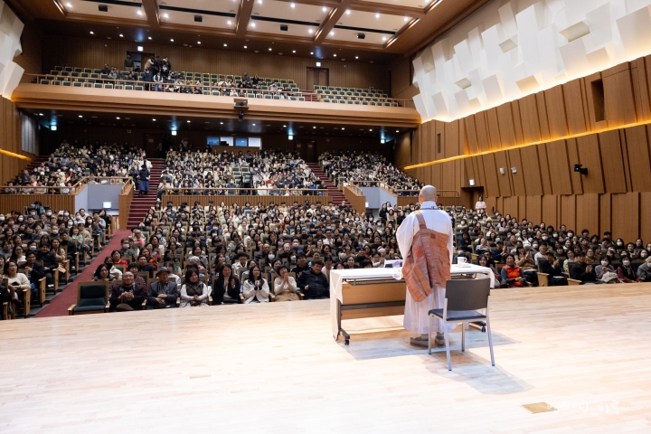 이어서 스님을 소개하는 영상이 상영되고, 영상이 끝나자 스님이 큰 박수를 받으며 무대로 걸어 나왔습니다. 스님은 환한 웃음과 함께 인사말을 했습니다.