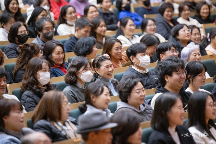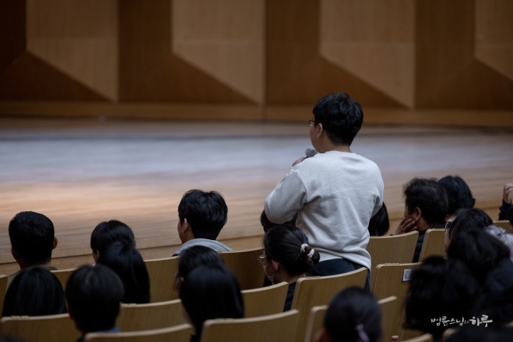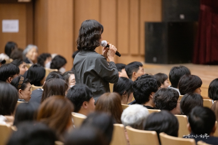 이어서 사전에 질문을 신청한 분들부터 스님에게 질문을 했습니다. 이어서 현장에서도 누구든지 손을 들고 스님에게 질문을 했습니다. 두 시간 동안 열 명이 자신의 고민을 말하고 스님과 대화를 나누었습니다. 그중 한 명은 사춘기 아들이 엄마 말만 안 듣는다며 답답한 마음을 털어놓았습니다.