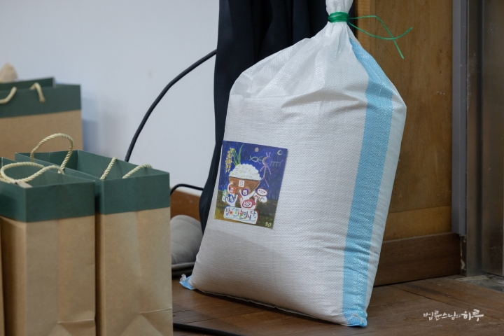 '사랑 어린 배움터'에서는 바쁜 가운데 시간을 내어준 스님에게 직접 생산한 쌀, 계란, 산야초 효소액을 선물해 주었습니다.