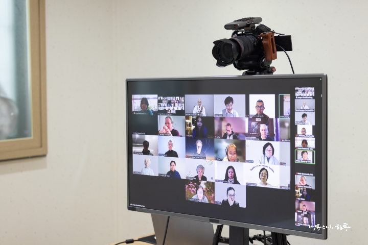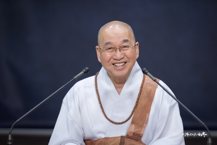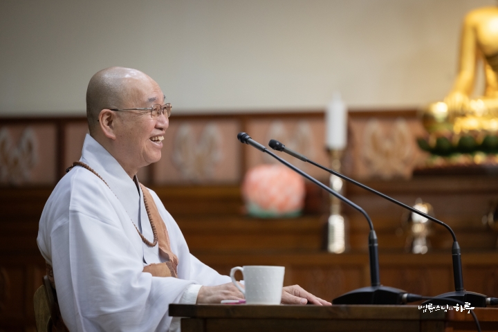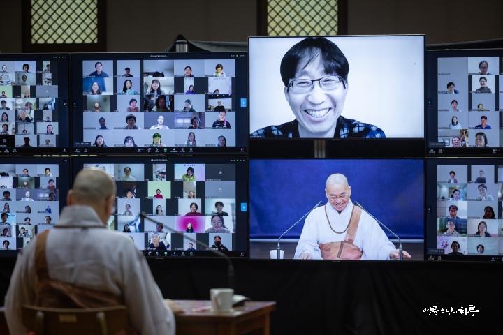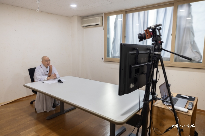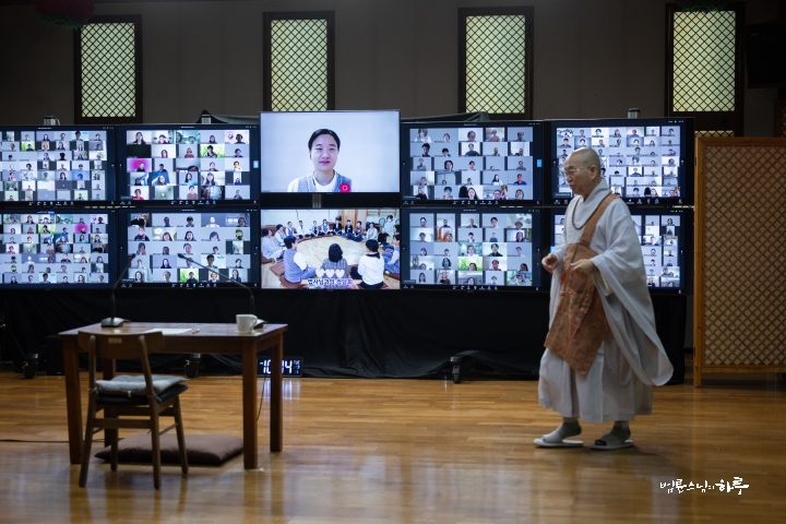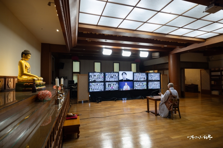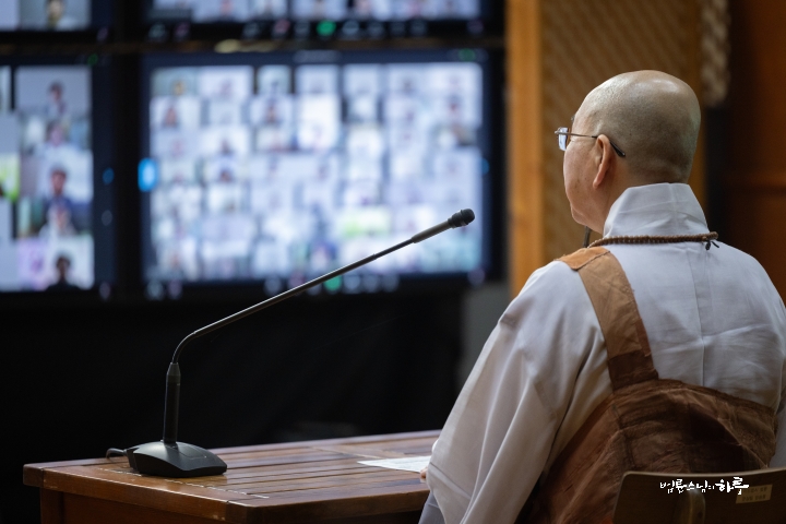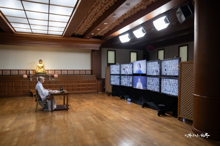 스님은 새벽 수행과 명상을 마친 후 라이브 담마 토크(Live Dharma Talk)를 하기 위해 오전 8시부터 정토회관 2층 정진실에 마련된 카메라 앞에 자리했습니다. 미국, 캐나다, 유럽, 아시아 등 다양한 나라에서 영어를 사용하는 200여 명의 정토회 회원들이 화상회의 방에 접속한 가운데 전 세계 정토회 회원들을 위해 온라인 즉문즉설 강연을 하며 하루를 시작했습니다.