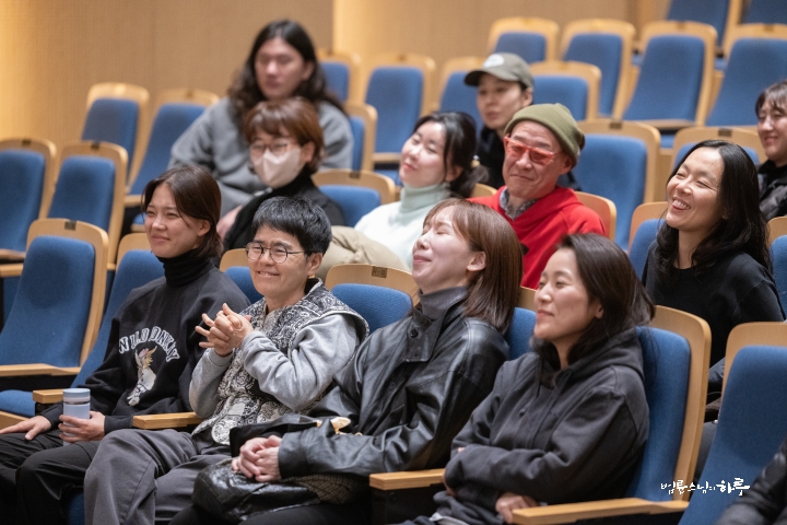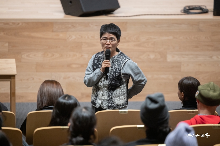 “이렇게 운동 삼아 같이 일을 했는데 소감을 한번 말해 볼 사람 있나요? 오늘 이 시간은 특별히 법문을 하는 시간이 아니고 그냥 대화의 시간이에요. 그냥 헤어지려니까 조금 섭섭하기도 해서 같이 모인 겁니다. 또 길벗 대표인 노희경 작가님이 몸이 좀 안 좋아서 일은 못하더라도 얼굴은 보여야 하잖아요. 작가님이 인사부터 해 주세요.”