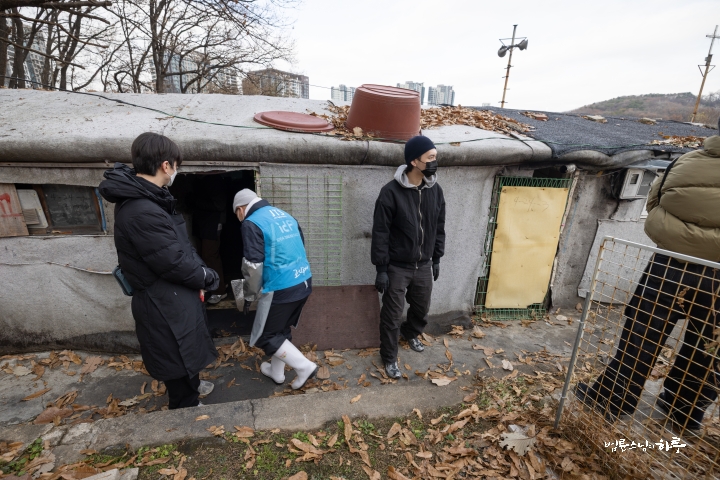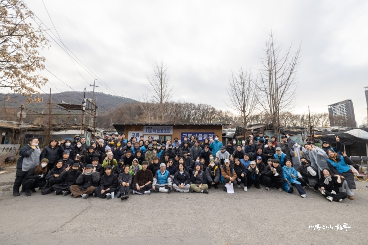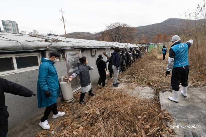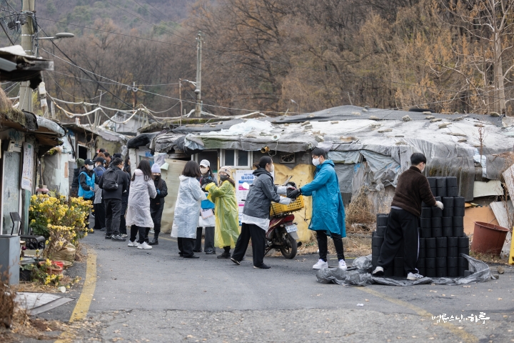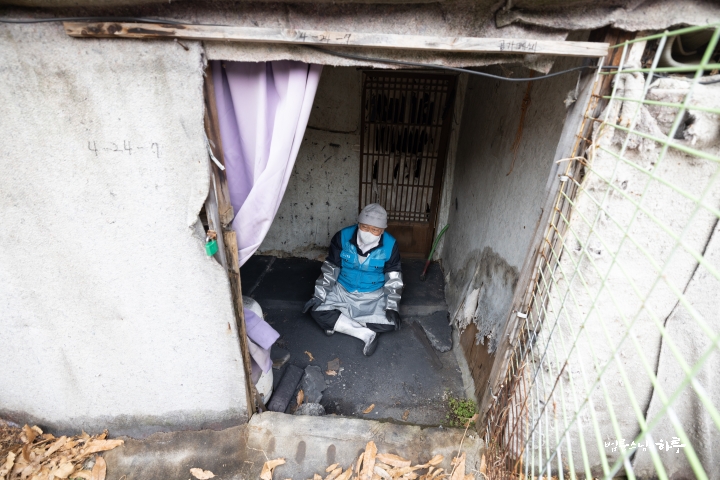 “오늘은 서울에 남은 마지막 판자촌인 이 동네에서, 노인들과 주민들이 겨울을 따뜻하게 보낼 수 있도록 연탄을 지원하기로 했습니다. 그런데 이곳도 곧 재개발이 이루어진다고 해 이미 많은 분이 이사했고, 주민 수도 많이 줄었다고 합니다. 그래서 아마 올해가 마지막 연탄 지원이 될지도 모르겠습니다.