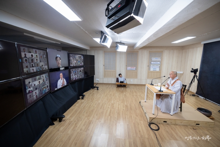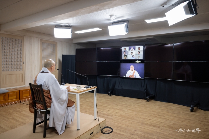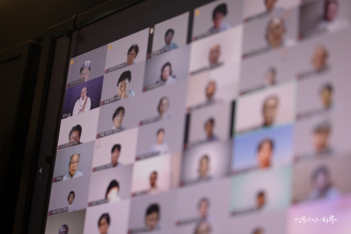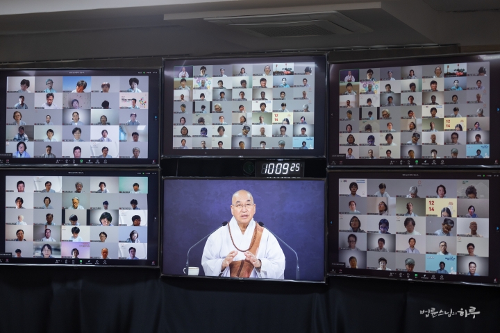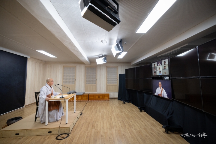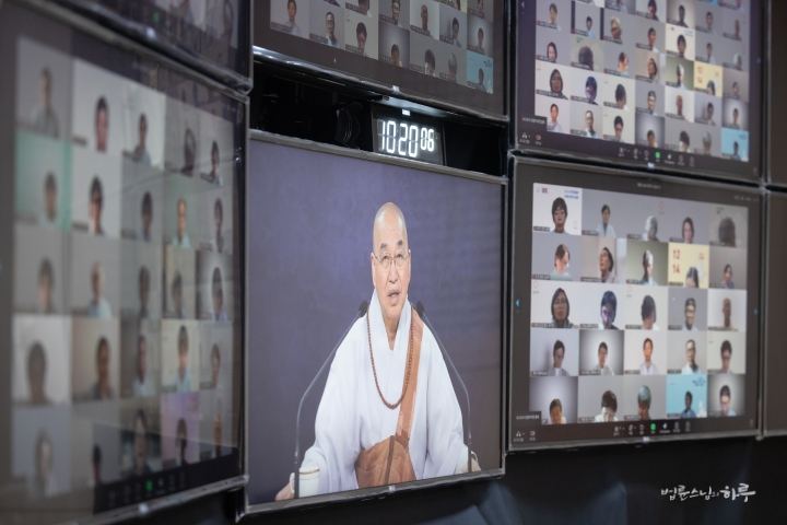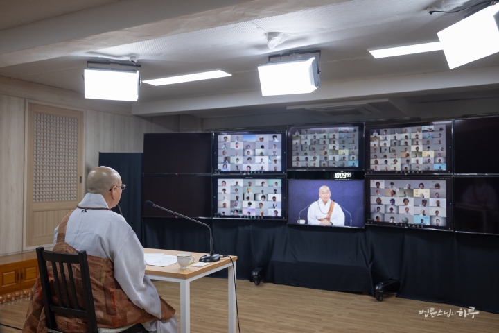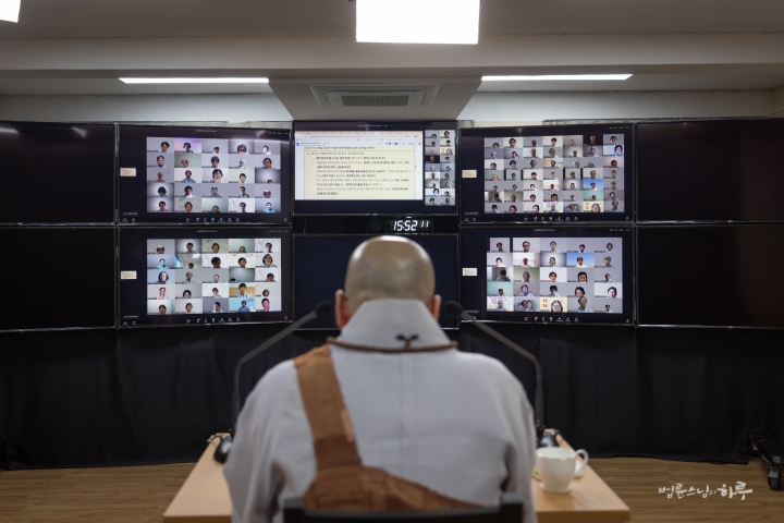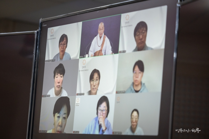 스님은 새벽 수행과 명상을 마친 후 아침 7시 30분부터 정토회 상임 천일준비위원회와 온라인으로 간담회를 하며 하루를 시작했습니다.