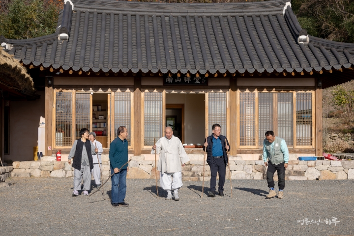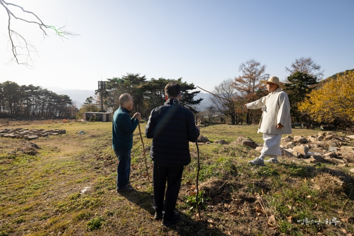 스님은 두 분에게 미리 준비해 온 지팡이를 건넸습니다. 지팡이를 잡고 조심조심 산길을 내려오자 곧 산 중턱에 위치한 넓은 평지가 나타났습니다.