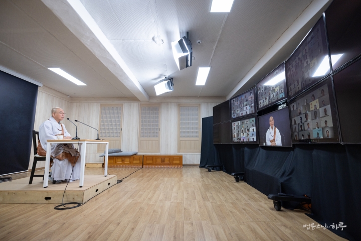전국 법사단 100여 명이 화상 회의 방에 입장한 가운데 삼귀의와 반야심경 봉독을 한 후 전국 법사단 연수를 시작했습니다. 법사단은 삼배의 예로 스님에게 입재 법문을 청했습니다. 스님은 대중을 효과적으로 지원하는 것과 간섭하는 것 사이에 중도의 길을 가려면 어떤 관점을 가져야 하는지 이야기해 주었습니다.