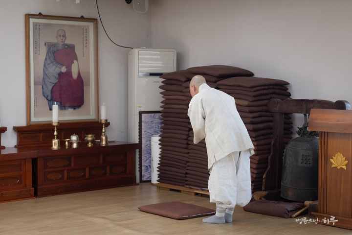 스님은 한쪽 편에 마련된 용성 조사님의 영정에 참배한 후 대웅전을 나왔습니다.