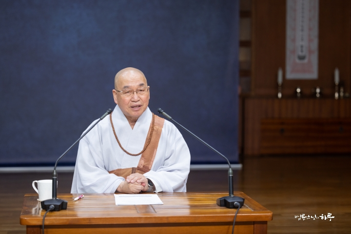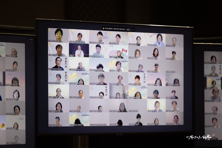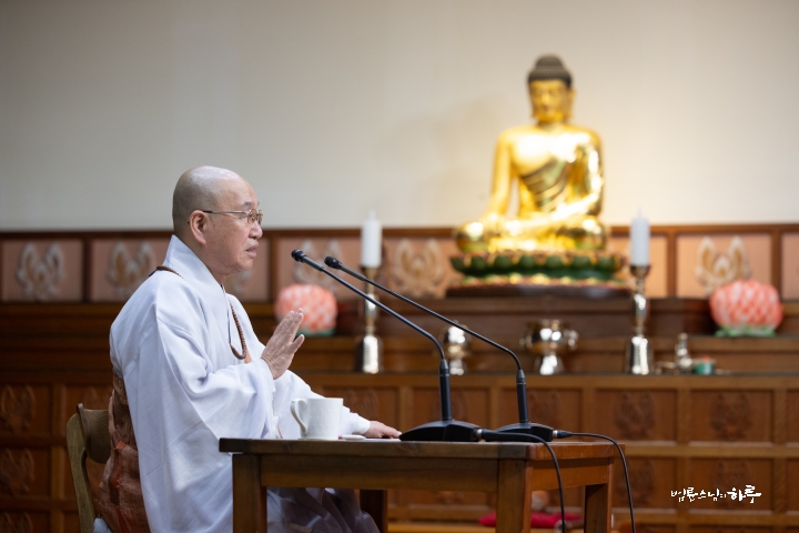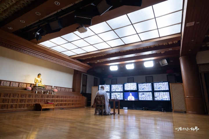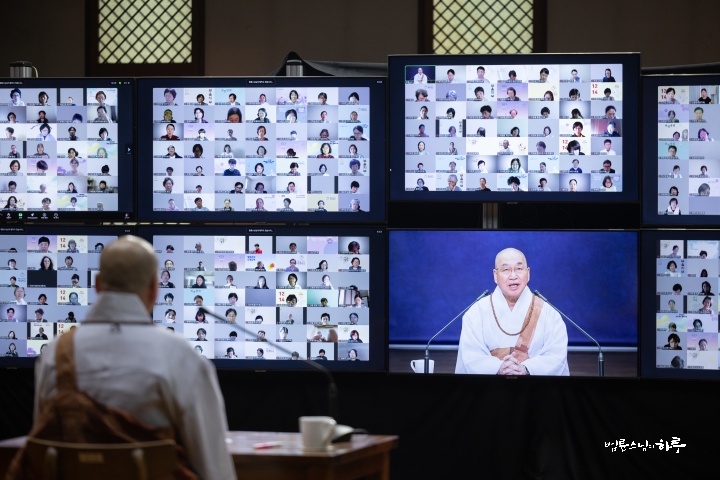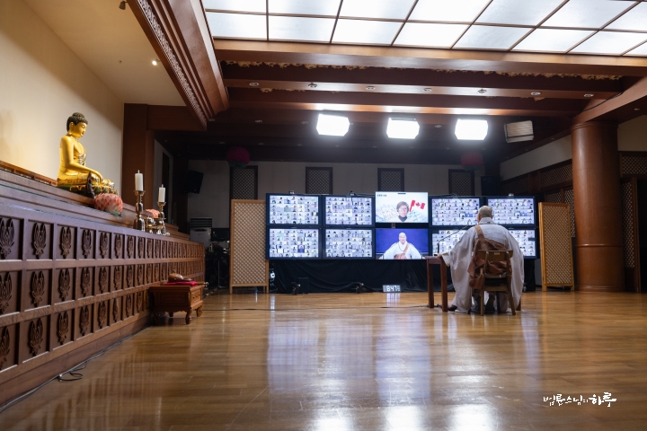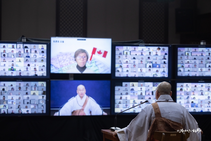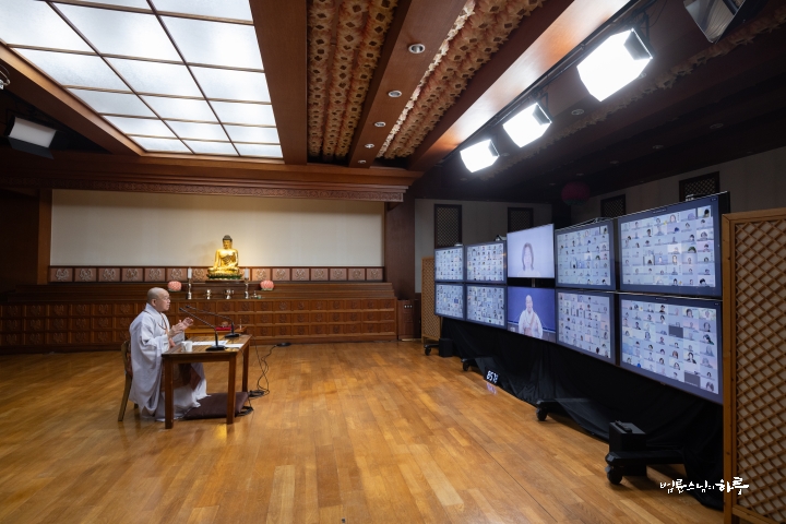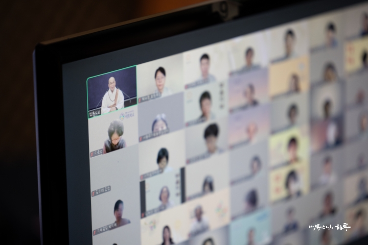 대화를 마치고 나니 밤 9시가 훌쩍 넘었습니다. 사홍서원으로 생방송을 마친 후 전법회원들은 모둠별로 화상회의 방에 입장하여 마음 나누기 시간을 가졌습니다. 스님은 늦게까지 업무와 원고 교정을 본 후 잠자리에 들었습니다.