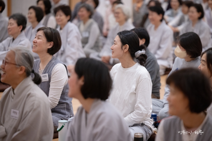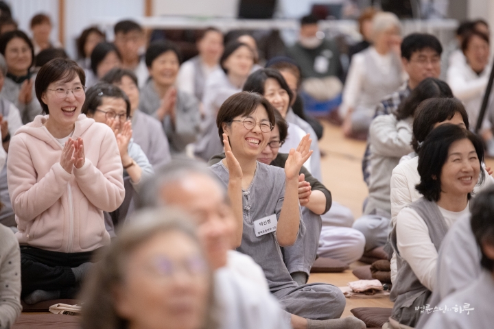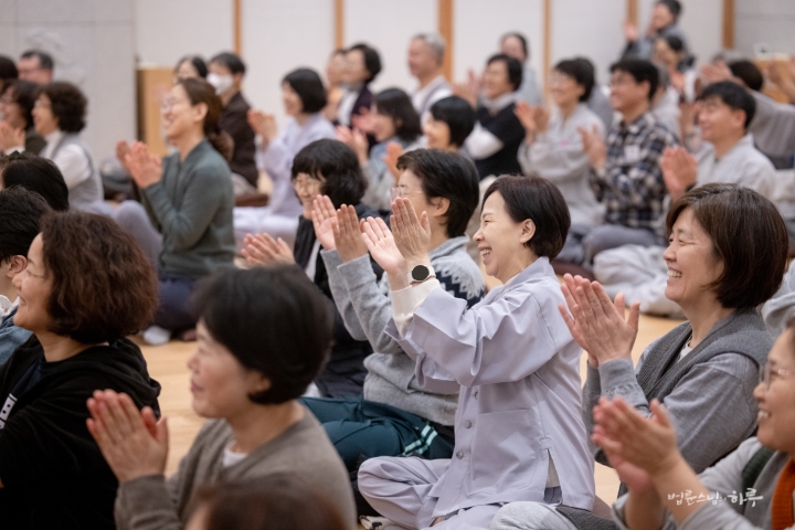 그런 점에서 어려움은 결코 나쁜 것이 아닙니다. 일반적인 관점에서는 ‘극복’이라 부르고, 수행의 관점에서는 ‘여일 하게 받아들이는 것’이라 부릅니다. 바로 거기서 진정한 자유가 열립니다. 이번 수련에 지회장이라 안 올 수도 없고, 팀장이라 눈치 보여서 억지로 오셨다 해도, 이왕 왔으니 마음을 내보세요. 10년을 하자는 것도 아니고, 1박 2일은 거꾸로 매달아도 지나갑니다. 불편하다고 움츠리면 더 힘들고, 추울 때도 ‘아, 춥다’ 하며 괴로워하지 말고, ‘시원하네’ 하고 받아들이면 됩니다. 이런 불편함과 어려움을 겪는 과정이 훗날 우리의 삶 전체에 큰 도움이 됩니다. 그렇게 함께 정진해 봅시다.”