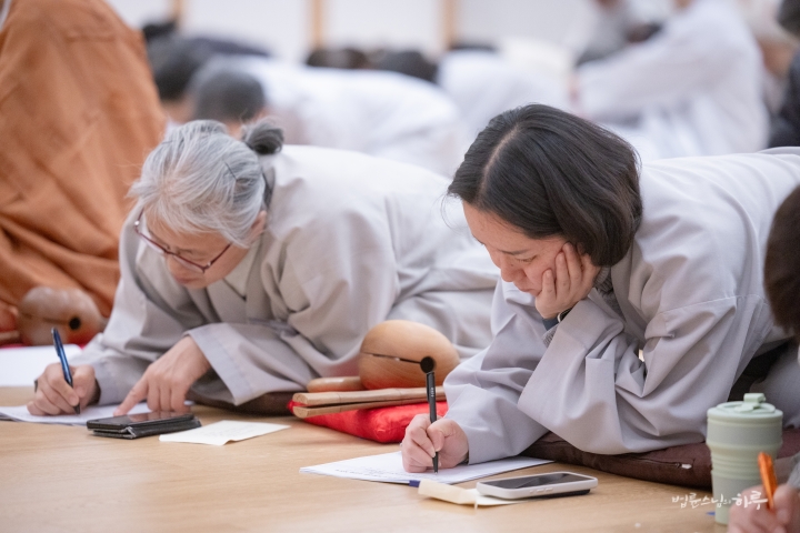 1,080배를 다 마친 대중은 오늘 회향 수련을 하면서 느낀 소감을 작성한 후 잠자리에 들었습니다. 직접 한 공간에 모이지 않아도 1,200여 명의 대중이 온라인으로 연결되어 지난 만일을 함께 돌아볼 수 있었습니다.