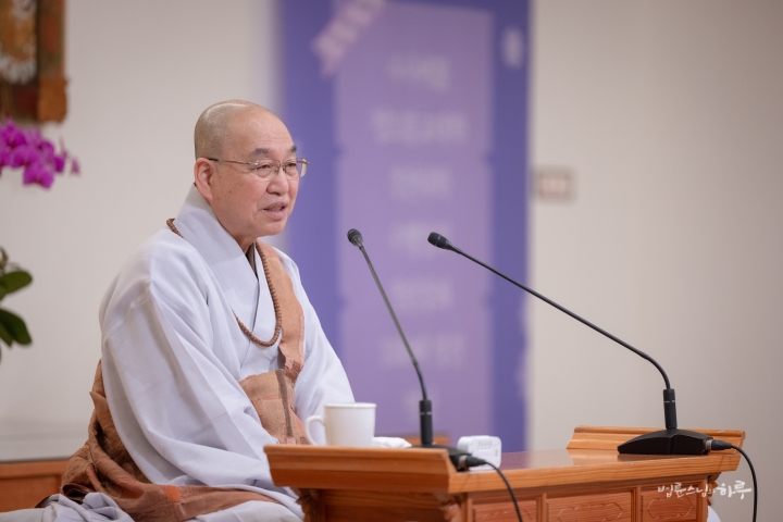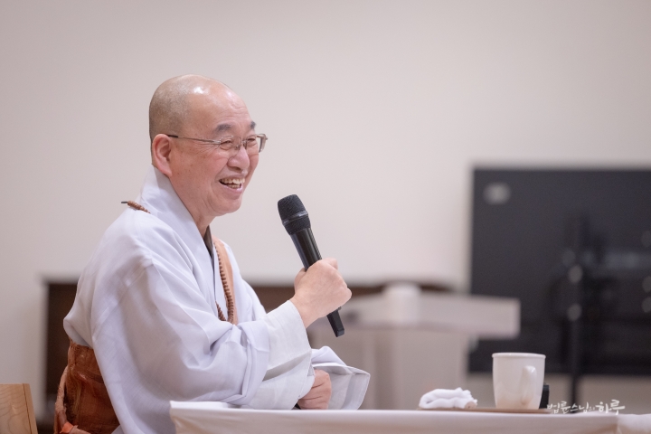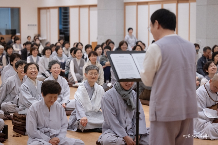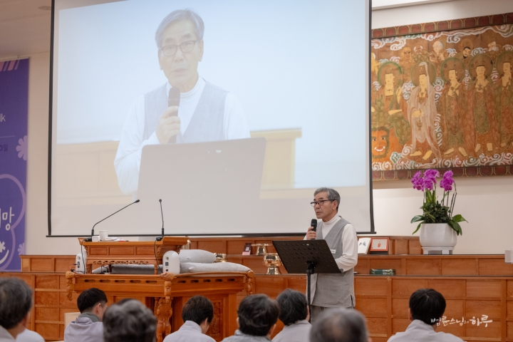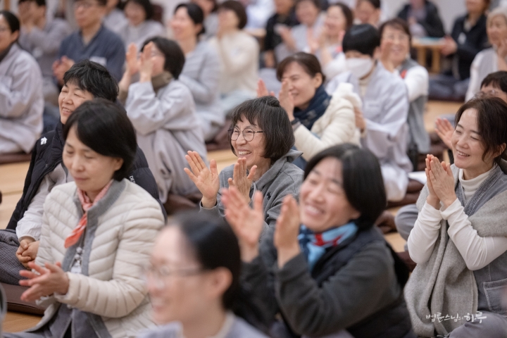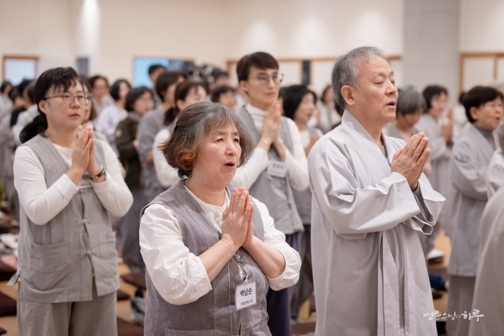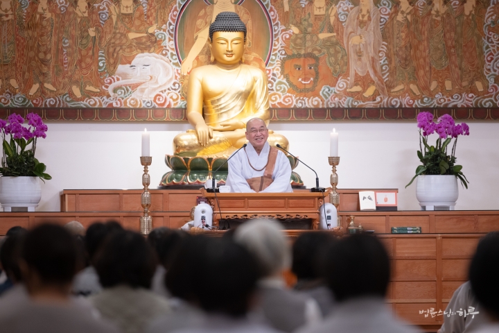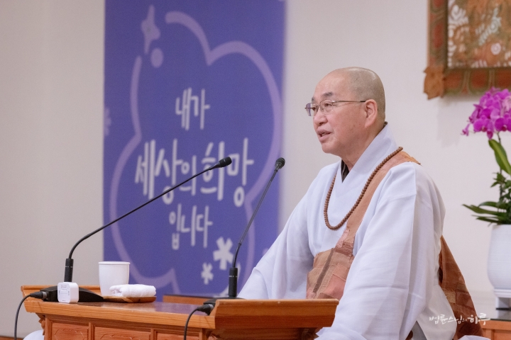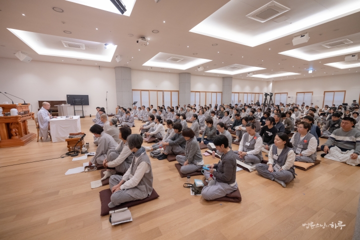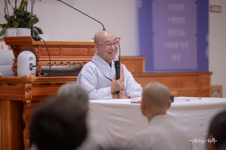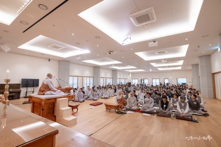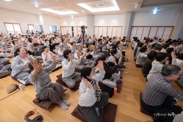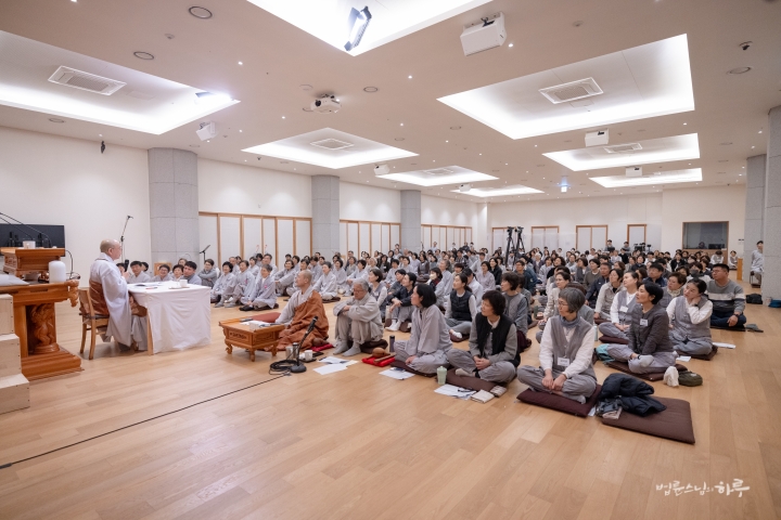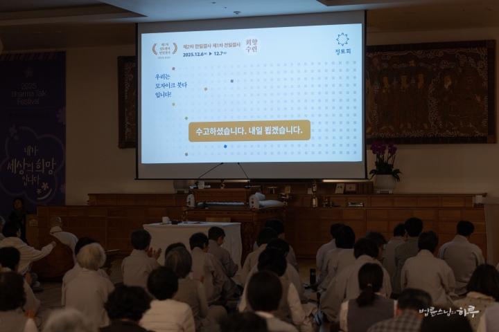 “정진을 잘 마쳤습니다. 특히 실천 활동에 참여하신 분들의 소감 발표는 우리 모두에게 큰 감동을 주었습니다. 그중에서도 정토사회문화회관 관리를 맡고 있는 거사님의 발표는 깊은 울림을 전해주셨습니다. 정토회는 많은 이들이 불가능하다고 여길 만한 일들을 가능하게 만들어왔습니다. 그 가운데에서도 가장 어려운 일 중 하나가 바로 정토사회문화회관 관리가 아닌가 생각됩니다. 이 자리를 빌려 전국 각지에서 실천 활동 장소를 관리하고 계신 모든 봉사자들, 그리고 특히 정토사회문화회관을 책임지고 운영하고 계신 봉사자들께 진심으로 박수를 보내며 감사드립니다.