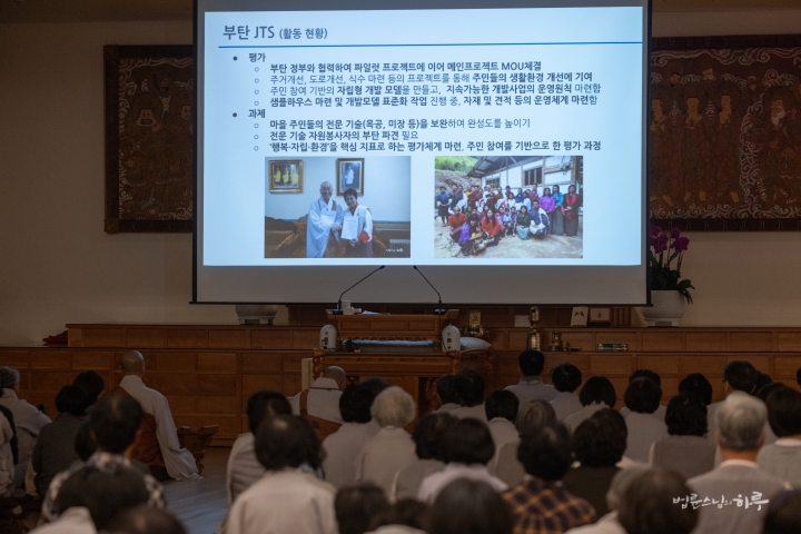 그러니 여러분께 제안드립니다. 50대 중반쯤 되어 명예퇴직을 하거나 정년퇴직을 하신다면, 그 시점에 정토회에 들어오셔서 활동해 보시길 바랍니다. 국내에서도 자원봉사 인력이 필요하지만, 영어가 가능하거나 사회 활동 경험이 있는 분들은 해외 활동에 나서는 것도 매우 중요합니다. 현재 필리핀과 인도에도 대중부 출신 활동가가 회계를 포함해 다양한 역할을 맡고 있으며, 부탄에도 거사님들이 두세 달씩 자원봉사를 다녀오고 계십니다. 앞으로 정토회의 해외 활동을 확장하려면, 대중 여러분의 해외 진출이 필수적이라고 생각합니다.
