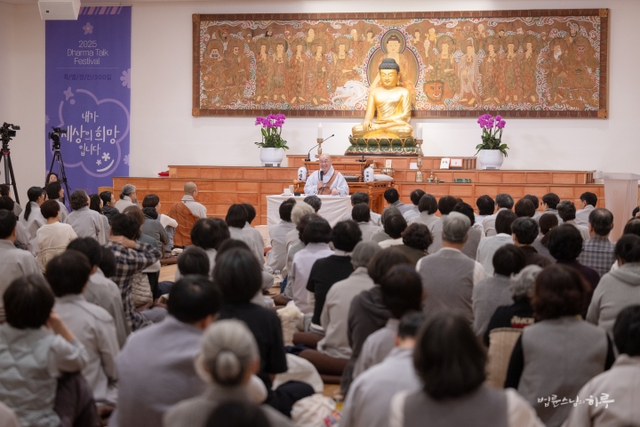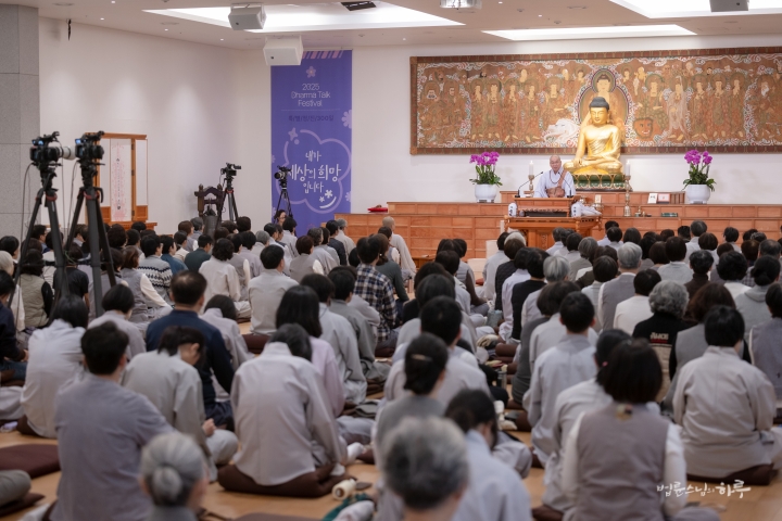 이어서 대중이 삼배의 예로 법문을 청했습니다. 스님은 정토회가 걸어온 길을 돌아보며 삶의 매 순간이 곧 수행임을 이야기했습니다.