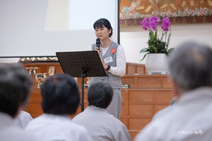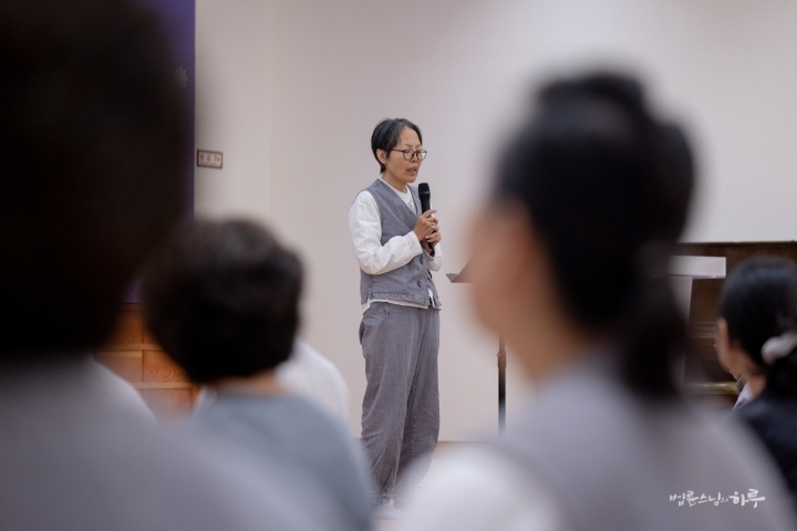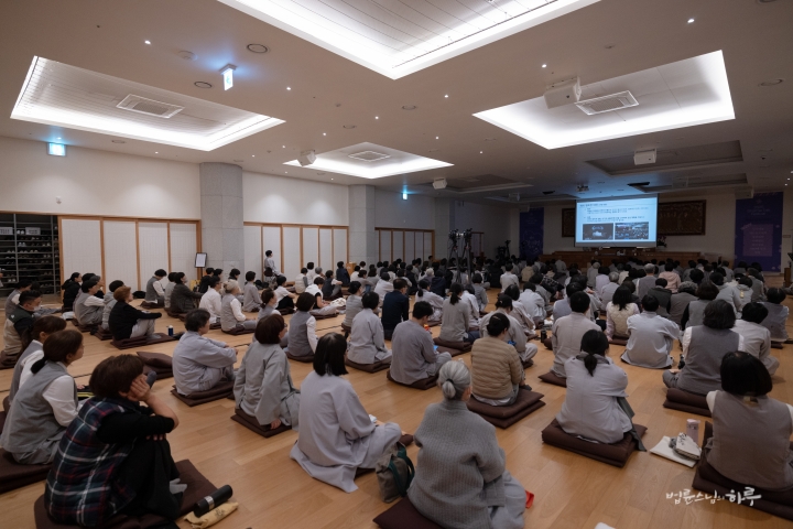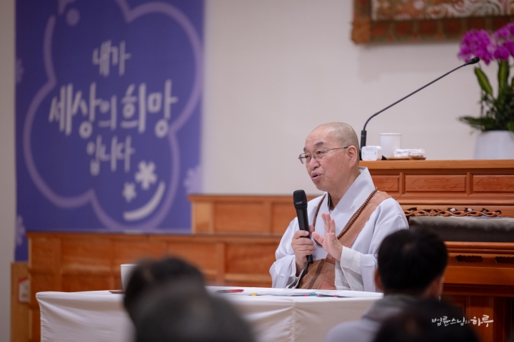 감동적인 사례담을 뒤로하고 다시 스님을 모시고 정리말씀을 청해 들었습니다. 스님은 정토회가 기후 위기 시대에 새로운 삶의 모델을 만들고, 정토회다운 문화를 창조해 나가야 한다는 점을 강조했습니다.