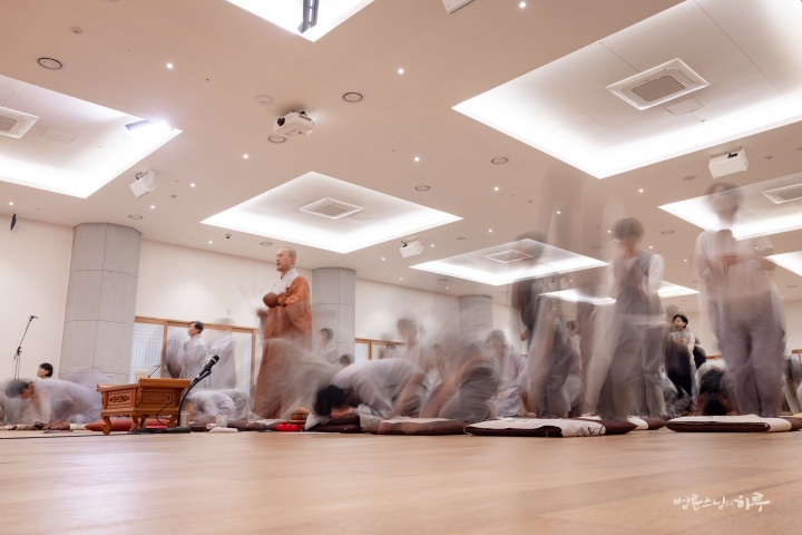 천배 정진을 마치고 나서 사람들이 ‘어떻게 그 어려운 걸 해내셨어요?’ 하고 묻는다면, 그것은 세속의 눈으로 바라본 질문입니다. 수행자는 그런 질문 자체를 의미 있게 여기지 않습니다. 우리는 어떤 과제를 이겨내는 것이 수행이 아니라, 그 순간 깨어서 살아가는 것이 수행임을 기억해야 합니다. 이것이 바로 수행자의 삶입니다.