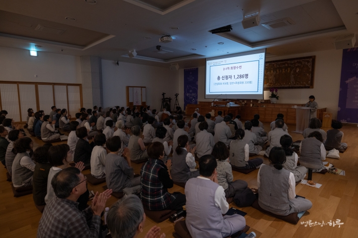 이어서 참가자 소개 시간을 가졌습니다. 정토사회문화회관뿐만 아니라 전국 으뜸절에서 많은 대중이 온라인 생방송을 시청하며 함께 수련을 했습니다.