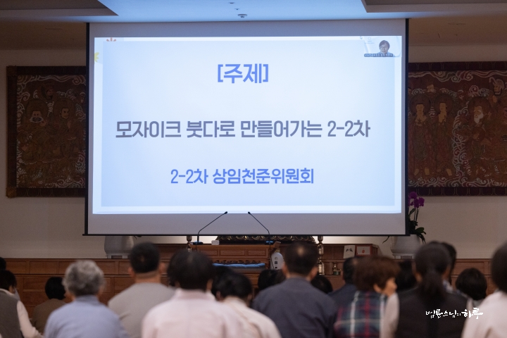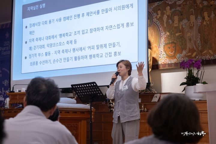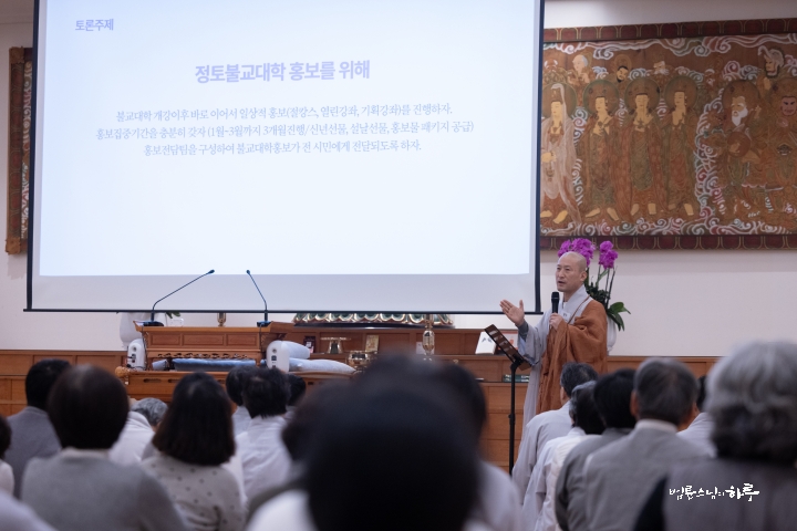 이어서 300일 특별정진위원장 유수 스님이 그동안의 경과를 보고한 후, 또 다른 토론 주제인 ‘일상에서 불교대학 홍보하기’에 대해 자세히 소개했습니다.