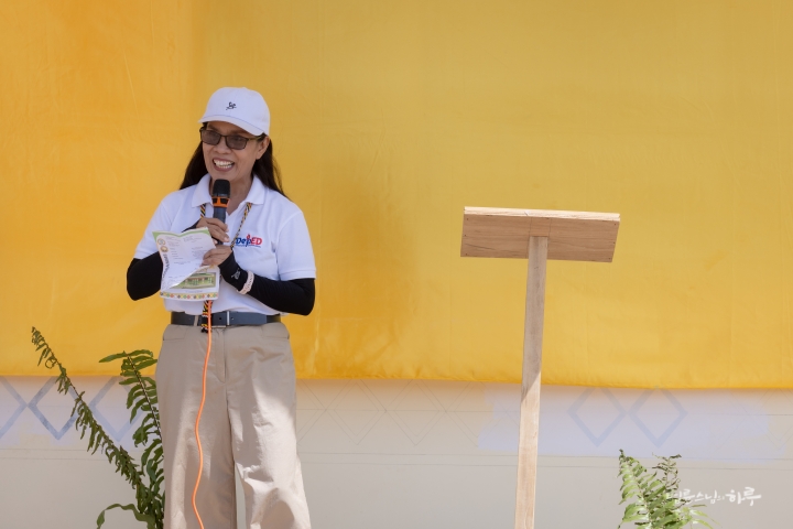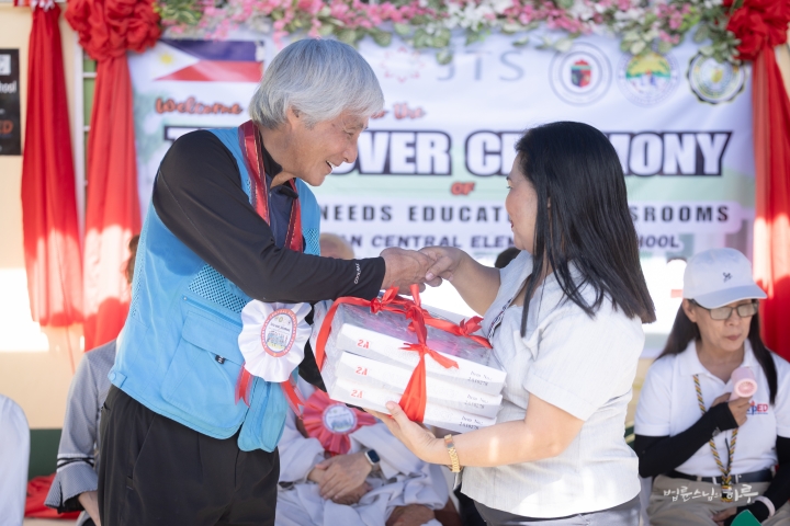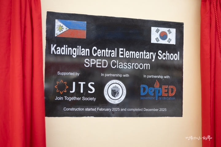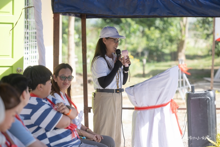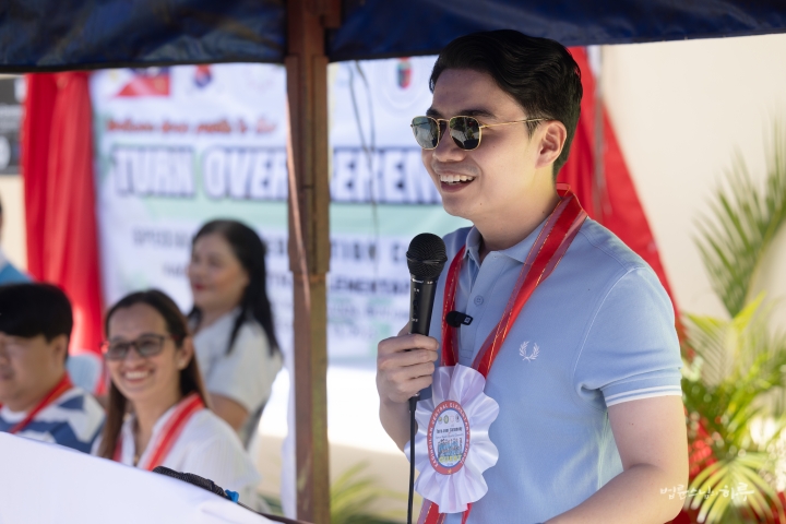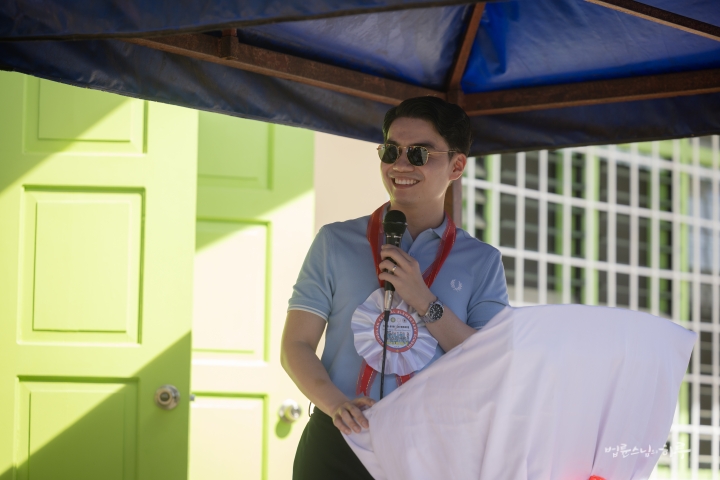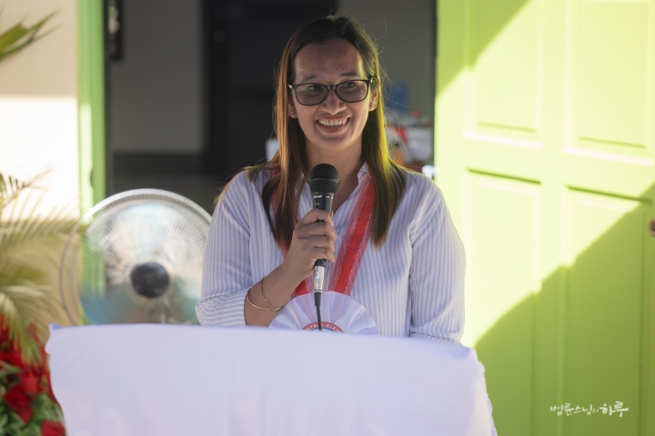 “여러분이 기뻐하시는 모습을 보니, 이 교실을 짓기 위해 애쓰신 많은 분들도 큰 보람을 느끼실 것 같습니다. 이 교실은 필리핀JTS, 카딩일란 지방 정부, 그리고 교육청이 함께 힘을 모아 지었습니다. 우리가 이렇게 협력하여 교실을 지은 이유는 어린이 여러분이 좀 더 편리하고 안전한 환경에서 더 좋은 교육을 받게 하기 위함입니다.