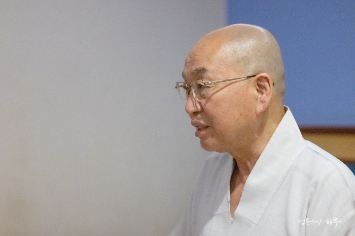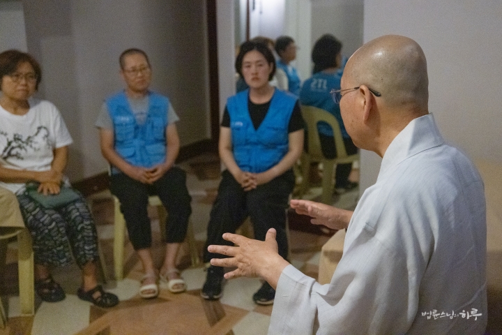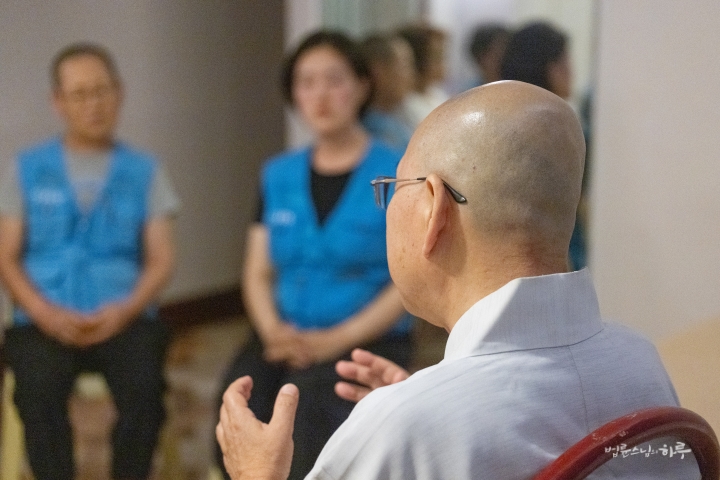 이어서 활동하면서 겪는 어려움과 의문점에 대해 두 시간 동안 대화를 나누었습니다. 자유롭게 스님에게 묻고 싶은 것을 묻고, 건의사항도 이야기했습니다. 그중 한 명은 손해 보고 싶지 않고 억울한 마음이 자주 든다며, 피해의식을 내려놓고 어떤 일이든 가볍게 해낼 수 있는 방법이 있는지 조언을 구했습니다.