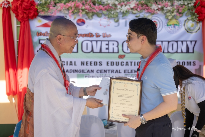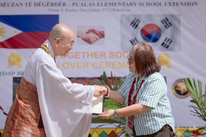 다음은 준공 증서 및 열쇠, 시계 전달식을 했습니다. 스님이 군수님에게 증서를 전달하고, 박지나 JTS 대표가 부키드논주 교육감에게 열쇠를 전달하고, 노재국 필리핀JTS 대표가 교장 선생님에게 시계를 전달했습니다.