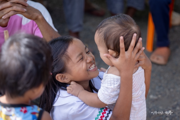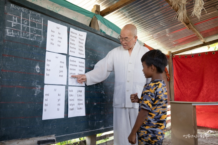 아이는 스님의 질문에 곧잘 대답했습니다. 아이의 머리를 쓰다듬으며 칭찬을 해준 후 다시 새로 지은 학교 앞으로 향했습니다.
