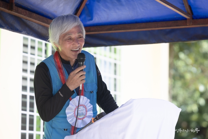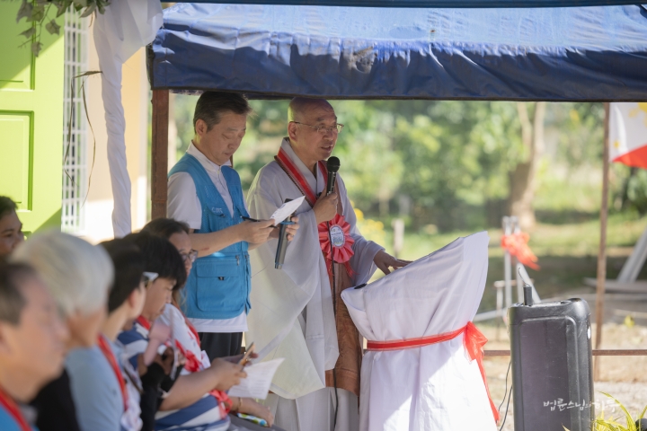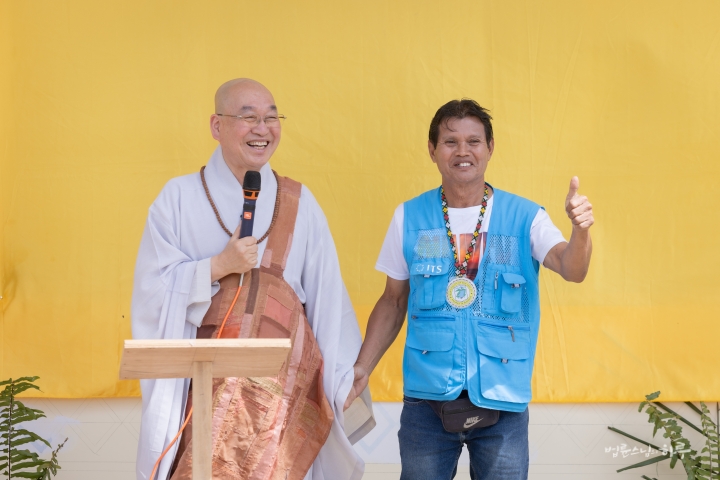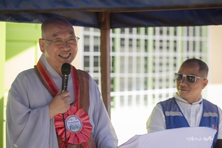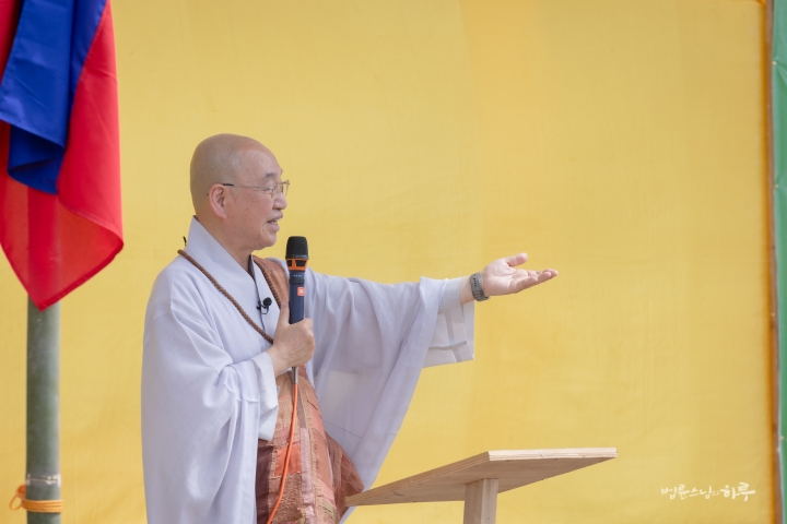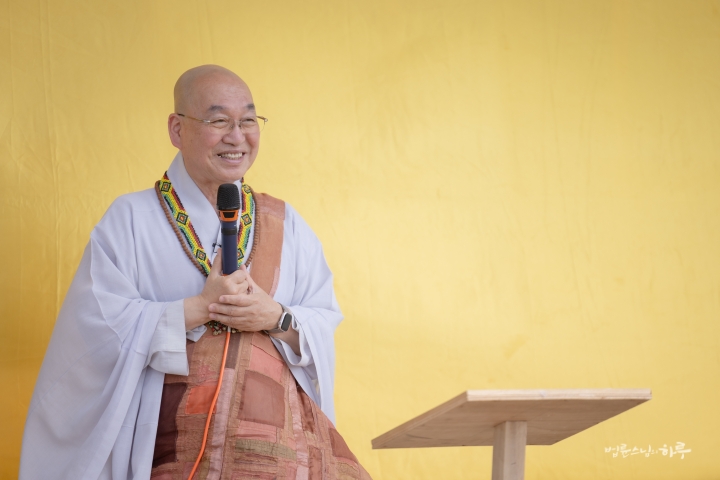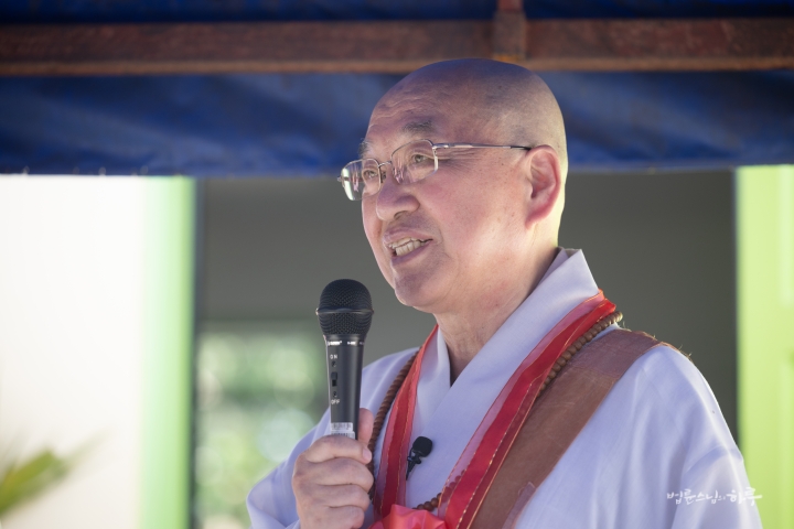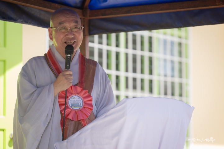다음은 스님이 큰 박수를 받으며 앞으로 나와 축사를 했습니다.