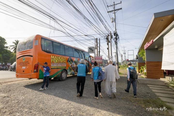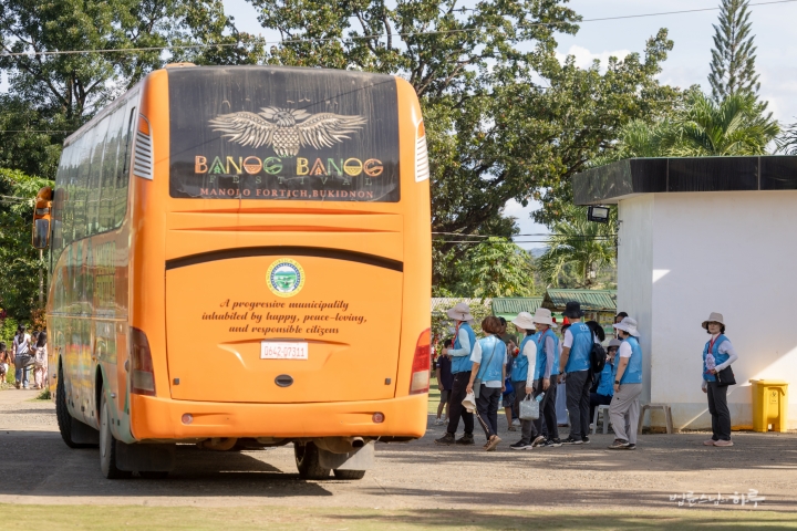 “돈카를로스 데겝뎁 초등학교는 올해 JTS가 지은 학교 중에서 가장 규모가 큰 학교입니다. 정규 교실이 네 칸이지만, 네 칸을 다시 분할해서 일곱 칸으로 사용할 수 있게 만들었습니다. 올해 5월에 민다나오 전역에서 선거가 있었기 때문에 그때까지 군청에서 예산 집행을 하지 못했습니다. 이를 예상해서 2월에 협약식을 미리 체결해 두었으나 결국 선거 뒤로 연기가 되었고, 7월이 되어서야 공사를 시작할 수 있었습니다. 그래서 지난주까지 아주 바쁘게 야근을 하면서 공사를 끝낼 수가 있었습니다. 군청에서 진입로까지 보수를 해준 상태입니다. 그러나 버스가 들어가기는 어려워서 트럭과 사륜구동 차로 갈아탄 후 학교로 이동하겠습니다.”