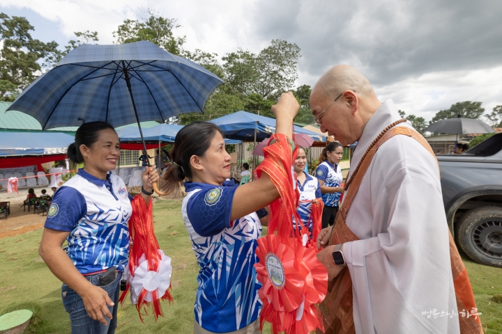스님은 다투에게 꽃목걸이를 걸어 주며 감사의 마음을 전했습니다.