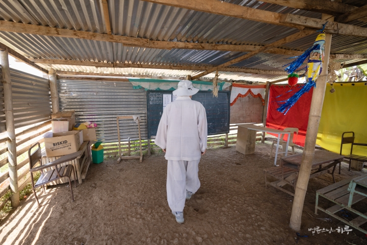 모두가 다과를 드는 동안 스님은 기존에 학교로 사용하던 임시 건물에 들어가 보았습니다. 주민들이 손수 대나무로 지은 임시 건물이었습니다. 칠판과 낡은 책상 몇 개가 전부였습니다. 전기 사정이 좋지 않은 상황에서 선생님들은 불편을 감수하며 아이들을 가르쳐 왔다고 합니다.