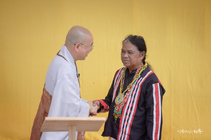 스님은 제시를 무대 앞으로 불러내어 꽃목걸이를 걸어 준 후 감사의 마음을 전했습니다.